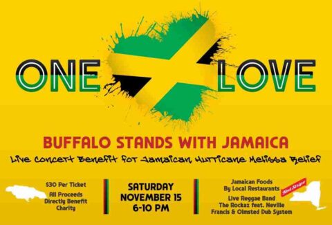 Benefit for Jamaica Hurricane Victims at the Terrace- November 15, 2025 from 6pm to 10pm. Tickets are $30. Estimated $22 billion in damages. Jamaican food, reggae band, Neville Francis, Olmsted Dub System music.