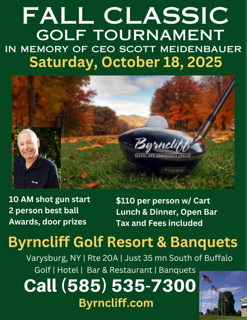 Byrncliff Resort Fall Golf Tournament- Two Person Best Ball- October 18, 2025 with 10am shot gun start. $110 per person with cart, lunch and dinner, open bar. Call 585-535-7300 to make a reservation. Beautiful country setting with fall colors.