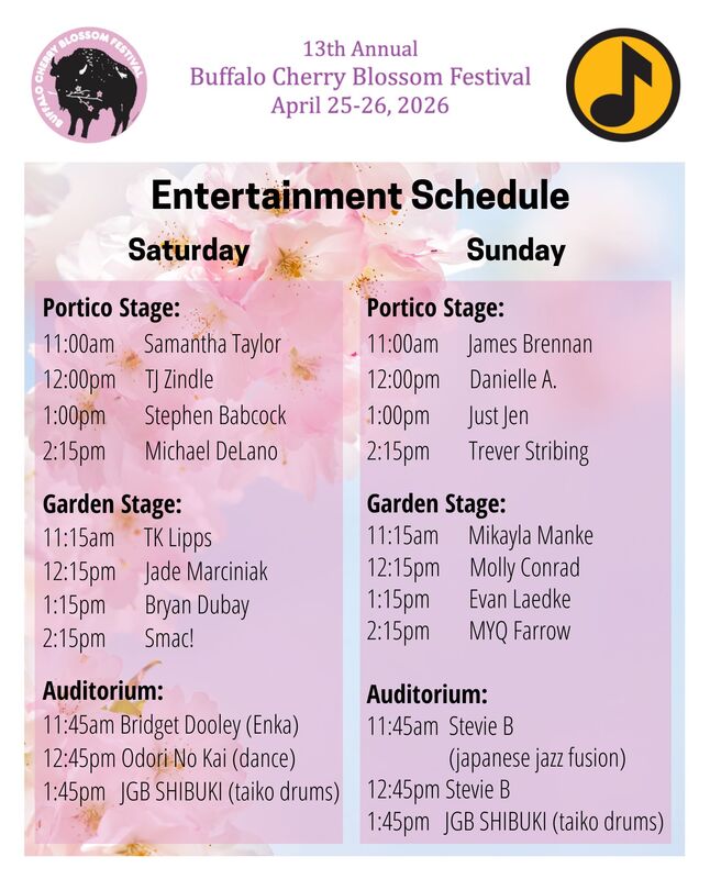 FREE-Buffalo Cherry Blossom Festival– April 25 and 26, 2026 in the back of the Buffalo History Museum featuring the beautiful trees, food trucks, music and non-profits. On April 26 at 3pm is the pink parade. Also, they have a tea on April 28- tickets.