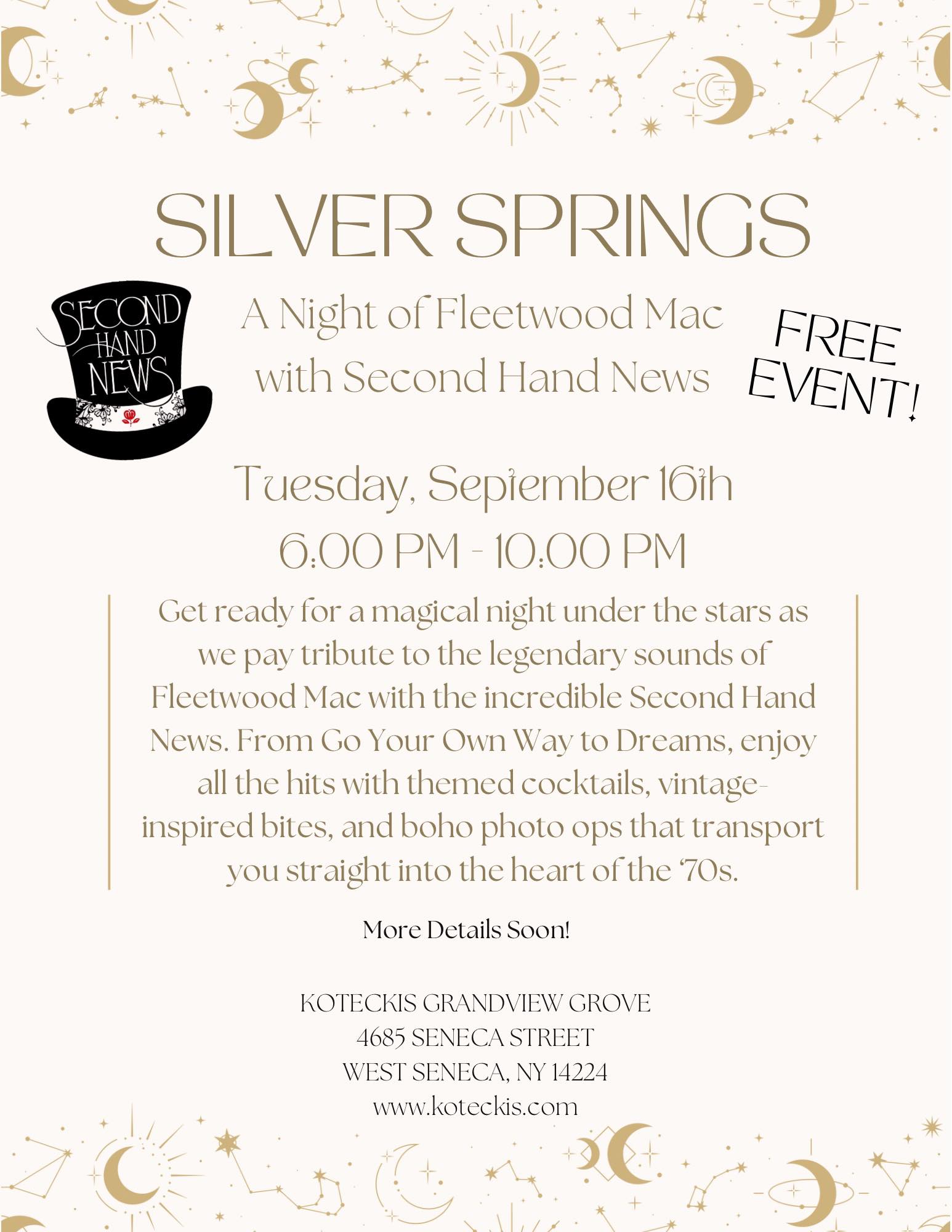 FREE- Second Hand News (Fleetwooc Mac) at Kotecki’s Grandview Grove– September 16, 2025 from 6pm to 10pm at 4685 Seneca Street, West Seneca.