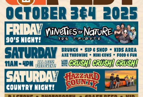 Saturday- 11am to 4pm -Saturday daytime features FREE fun for all ages with shopping, music, axe throwing, MINI COWS, and more Crush, Crush, Crush and Hazzard County in evening.