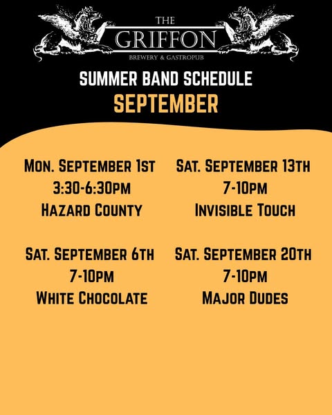 Live Music at Griffon Pub at 115 S. Water Street, Lewiston.September 20-7-10pm – Major Dudes