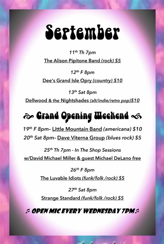 September 12- 8pm – Dee’s Grand Isle Opry