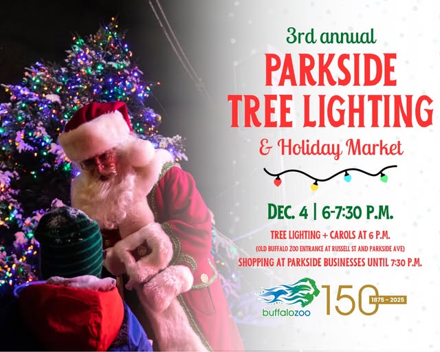 Parkside Tree Lighting and Holiday Market-December 4, 2025 from 6pm to 7:30pm at the Old Buffalo Zoo entrance at Russell and Parkside Ave. Tree lighting at 6pm, Santa, Choir.