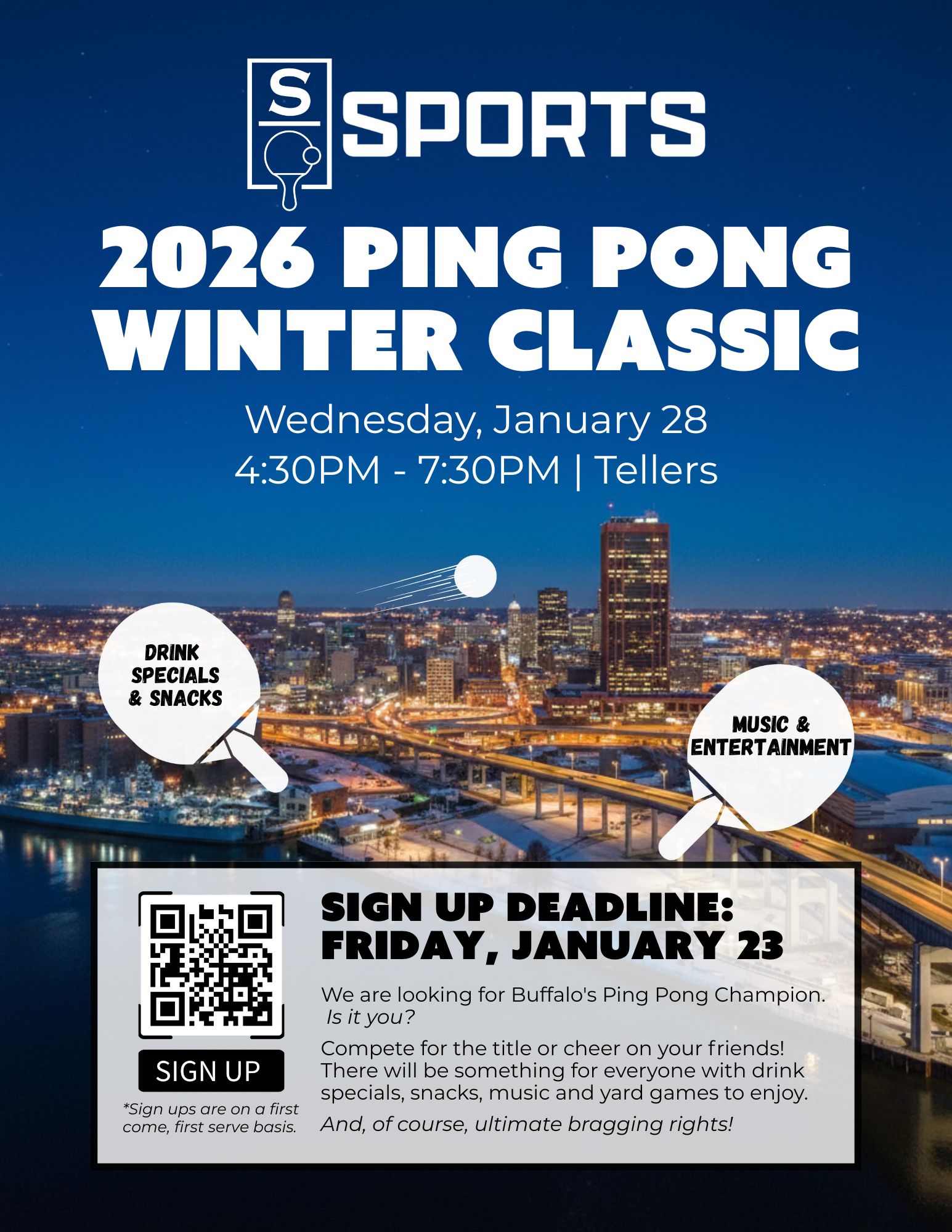 Ping Pong Winter Classic at Seneca One– January 28, 2026 from 4pm to 7p;m. Snacks, musics. It appears to be free to sign up but not clear.
