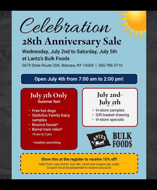 Lantz Bulk Foods Anniversary Party is July 5, 2025. Run by Amish, Lantz offers spices at 1/3 of the price of stores, homemade pasta, bulk pasta, baking products, candy, homemade bread and more. Awesome place. And, you can head on to Letchworth…