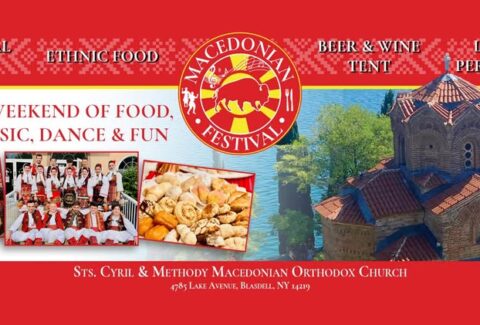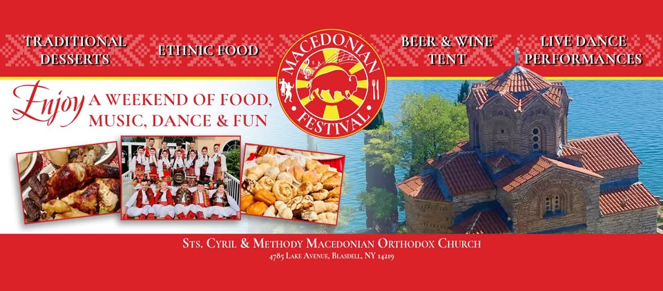 Macedonian Festival is July 12 to 13, 2025 featuring delicious food, beer and wine tent and desserts and folk dancing. $2 admission. Held at Sts. Cyril and Methody Orthodox Church, 4785 Lake Avenue, Blasdell, NY