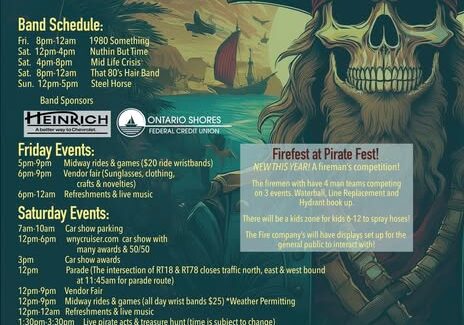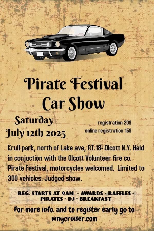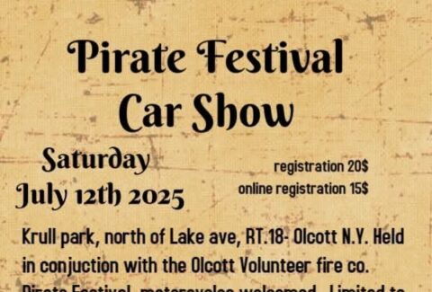 Pirates Festival at Olcott Beach is July 12 to 13, 2025. Features classic car show and parade at Noon on July 12, carnival rides and midway games, pirate encampment, demos, pirates invade beach firing cannon and flintlocks in a staged battle, music, kid’s treaure hunt. At Krull park and through Olcott Beach.
