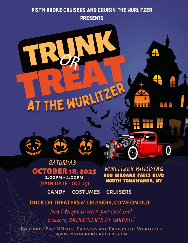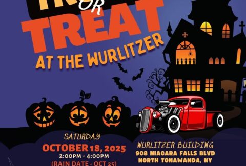 Trick or Treat at the Wurlitzer- October 18, 2025 from 2pm to 4pm at 908 Niagara Falls Blvd., North Tonawanda, NY when kids can trick or treat from decorated cars.