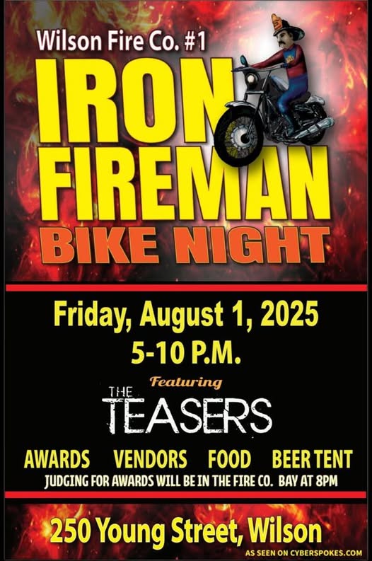 Wilson Iron Fireman Bike Nite on August 1, 2025 from 5-10pm with food, beer tent and live music by The Teasers at 250 Young Street. Phone Erin Wollaber 716-523-8195.