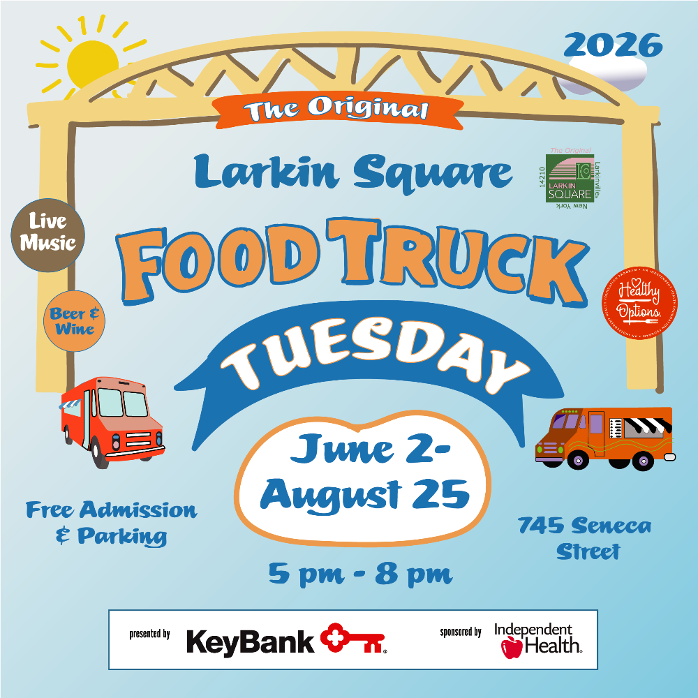 Food Truck Tuesday at Larkin Square– June 2 to August 25, 2026 from 5pm to 8pm at 745 Seneca St, Buffalo.Enjoy food from a roster of 40 plus food trucks along with live music each Tuesday.