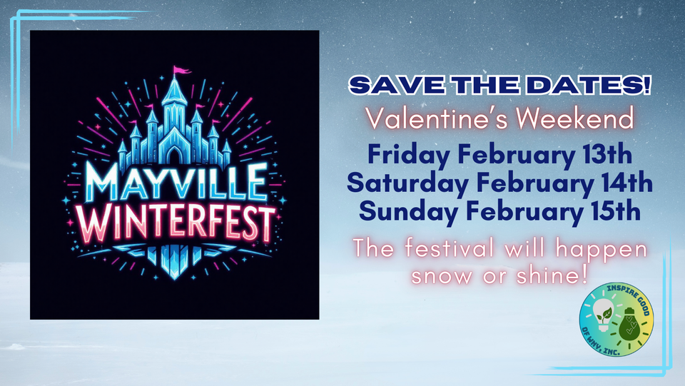Mayville Winter Festival – February 15, 2026. Features craft show, ice catle, music, horse drawn wagon rides, wood carving, fireworks, ice ball bowling, scavenger hunt, face painting, food trucks.