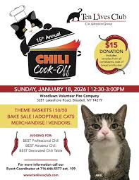 Ten Lives Club Chili Cook Off is January 18, 2026 from 12:30pm to 3pm at the Woodlawn Fire Hall, 3281 Lakeshore Road, Blasdell. $15