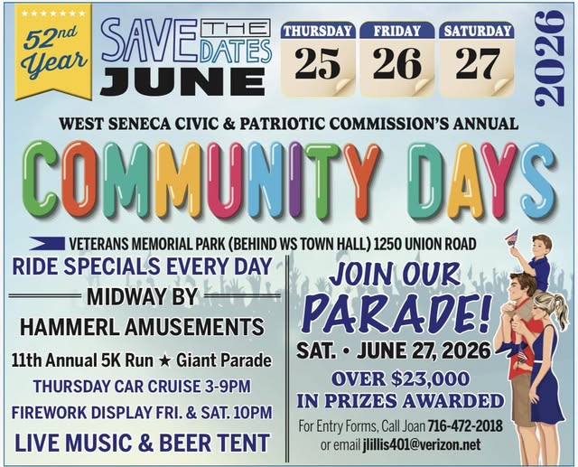 West Seneca Community Days- June 25 to 27, 2026 at Memorial Park, 1250 Union Road. Features 5k, Parade, car cruise, live music and fireworks.