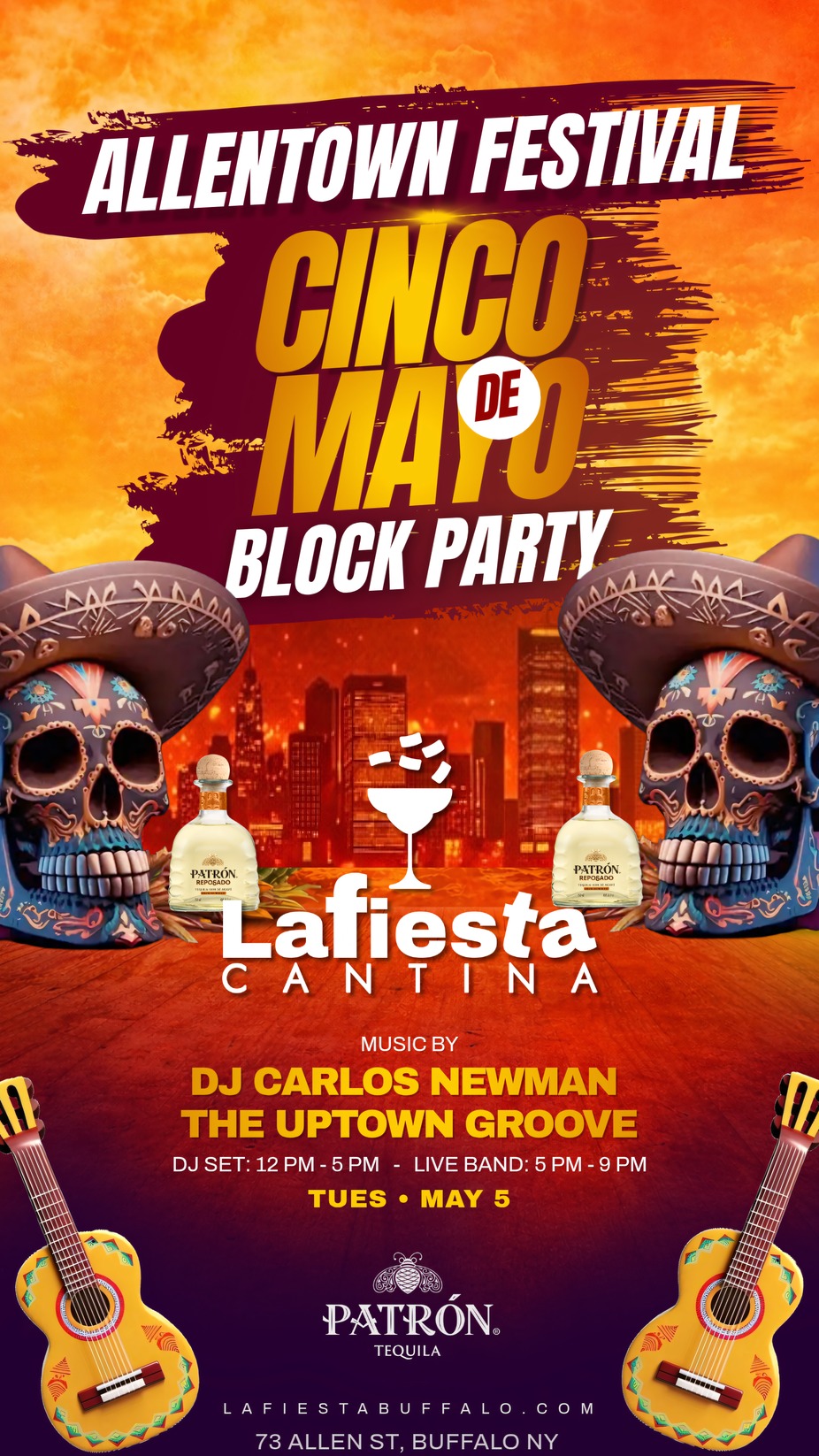 Allentown Cinco de Mayo Block Party at LaFiesta- May 5, 2026 from Noon to 11pm at 73 Allen Street. DJ Carlos Newman from 12PM–5PM 🎸 The Uptown Groove live from 5PM–9PM 🥃 Patrón specials 💃 festive vibes, great music, and the ultimate Cinco celebration!