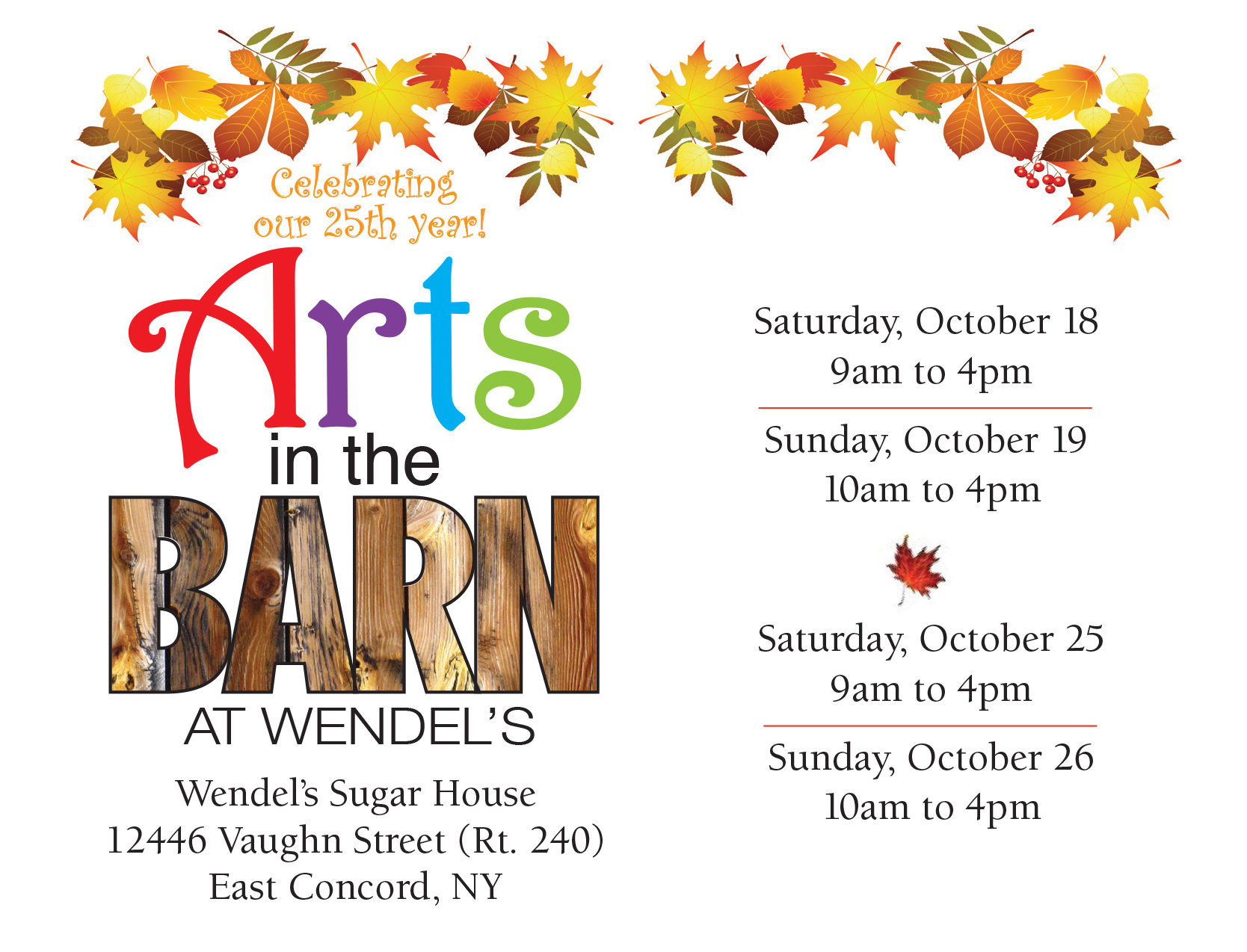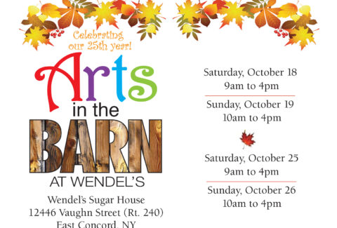 Art in the Barn at Wendel’s Sugar House– October 26, 2025- 9am to 4pm on Saturdays and 10am to 4pm on Sundays. Art, crafters, hayrides, pumpkin chukin and outdoor chicken BBQ.
