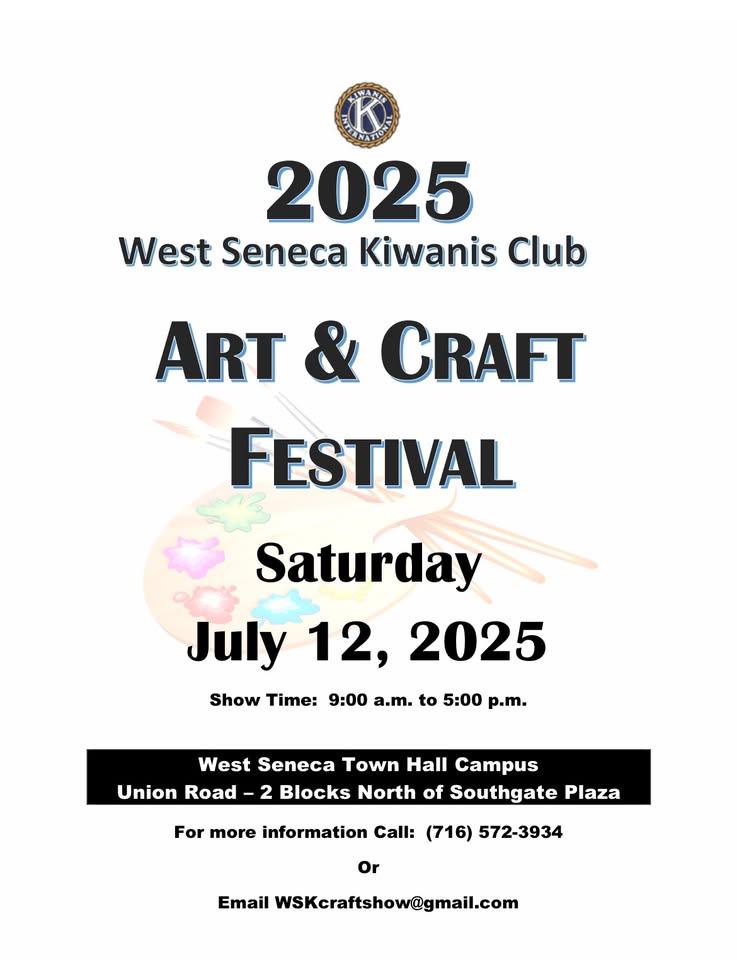 Art and Craft Feestival sponsored by the Kiwanis Club of West Seneca is July 12, 2025 from 9am to 5pm. Held at West Seneca Town Hall, 1250 Union Road, West Seneca. Vendors – call 716-572-4934. As of July 3, they are still accepting registrations.