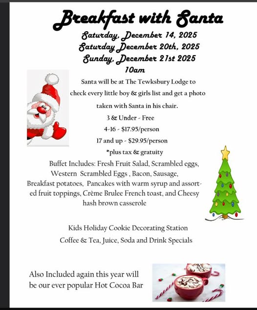 Breakfast with Santa at Tewksbury Lodge- December 21, 2025 at 10am. $29.95 for adults, $17.95 for kids 4 to 16 and 3 and under are free. Call 716-840-2866 for reservations. 249 Ohio St.