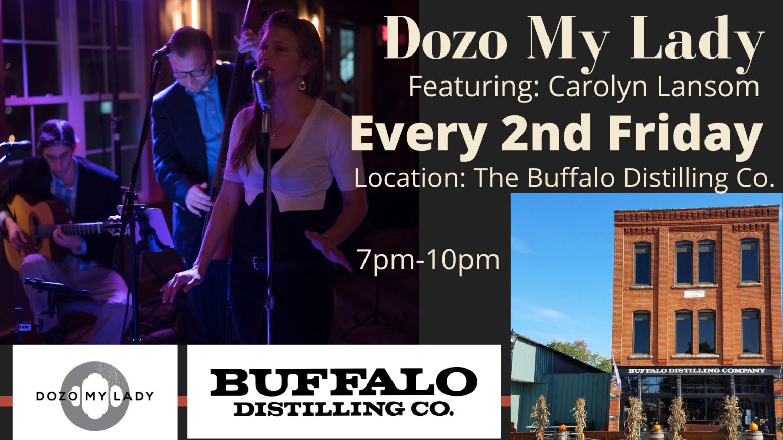 Carolyn Lansom and Dozo My Lady at Buffalo Distilling– January 9, 2026 from 7pm to 10pm at 860 Seneca Street. FREE