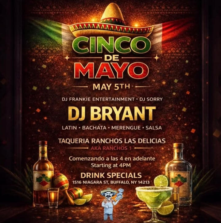Cinco de Mayo at Taqueria Ranchos– May 5, 2026 starting at 4pm at 1516 Niagara Street, Buffalo. DJ Bryant.