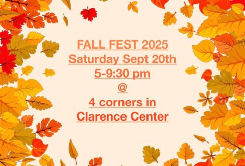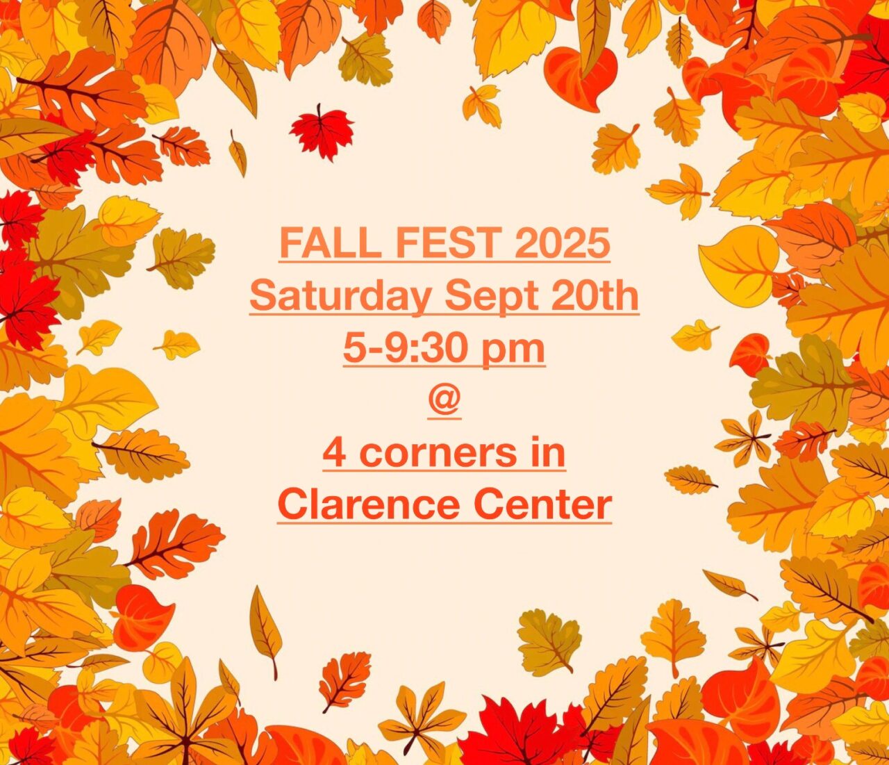 Clarence Fall Fest at Four Corners in Clarence Center- September 20, 2025 from 5pm to 9:30pm with food trucks, restaurant specials, cake walk and basket raffle.