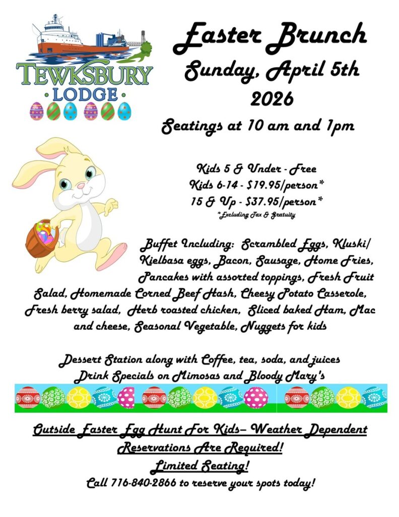 Easter Brunch at Tewksbury Lodge– April 5, 2026 from 10am to 2pm. Adults- $37.95, Kids 6-14- $19.95 and Kids 5 and under are free. Call 716-840-2866 for reservations.