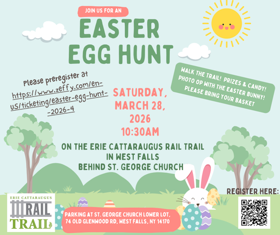 FREE Easter Egg Hunt in West Falls– March 28, 2026- at 10:30am to Noon on the Erie Cattaraugus Rail Trail in West Falls behind St. George Church at 74 Old Glenwood Road. FREE but register.