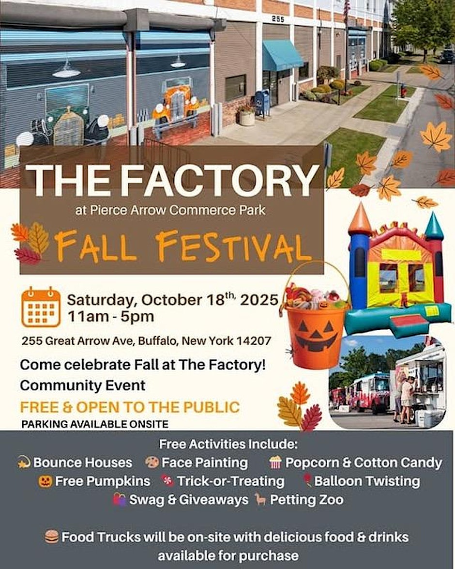FREE Fall Festival at The Factory for Kids– October 18, 2025 from 11am to 5pm at 255 Great Arrow Ave. with petting zoo, bounce houses, face painting, balloon animals and pumpkins. Indoors and outdoors. There is also a Buffalo Indie Lit event going on at the same time there.