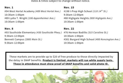 FREE Food-Mobile Markets for Impacted SNAP beneficiaries– November 22, 2025. Provides upto $20 of free produce to those impaced by SNAP delays. Must provide proof of SNAP benefits and photo ID.
