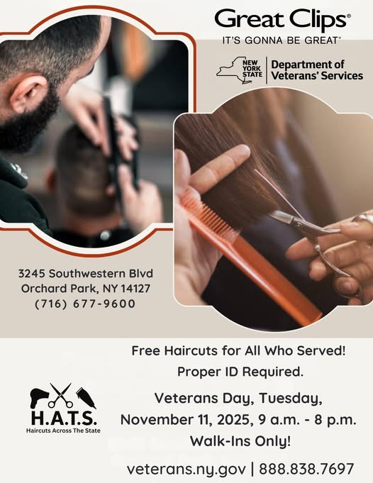 FREE Haircuts for Veterans at Great Clips– November 11, 2025- from 9am to 8pm at 3245 Southwestern Blvd., Orchard Park