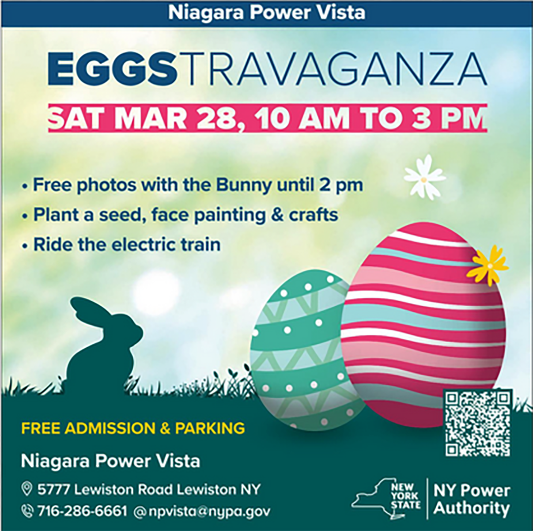 FREE – Spring Eggstravaganza at NY Power Authority on March 28, 2026 from 10am to 2pm where you get free photos of your kids with the bunny (10am to 2pm), crafts, face painting, free rides on the Niagara Scenic Trolley between Niagara Power Vista and the Gorge Discovery Center.
