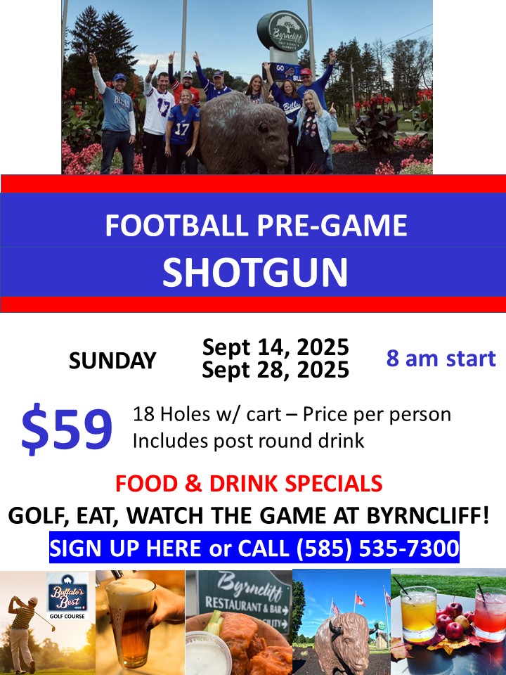 Golf Shotgun Before Bills Game at Byrncliff Resort– September 28, 2025 with 8am Start. $59 for 18 holes with cart and post round drink. Call 585-535-7300.