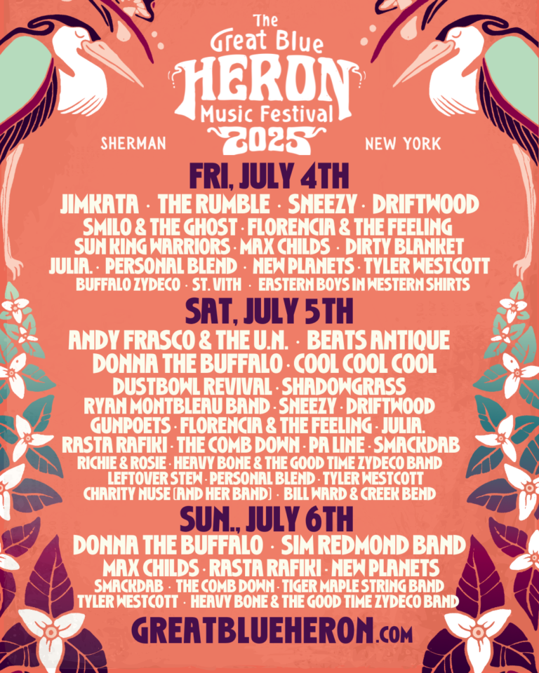 Great Blue Heron Festival- July 6, 2025 with Andy Frasco, Donna the Buffalo, Beats Anqiue, The Rumble, Dustbowl Revival, Cool Cool Cool, Shadowgrass and More. Get the list of all performers.