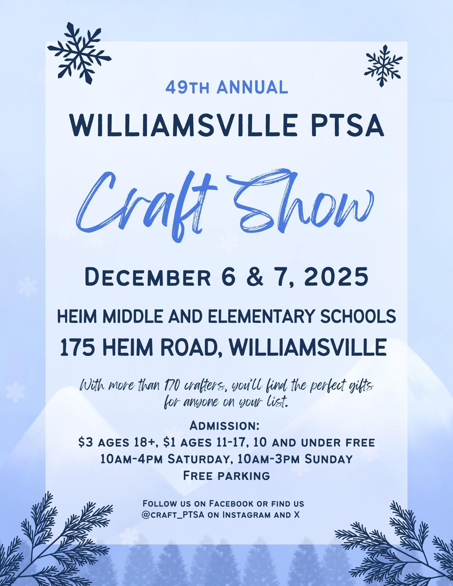 Heim Craft Show-Williamsville PTSA on December 7, 2025 at 175 Heim Road, Williamsville, NY. Admiission is $3 for adults and $1 for ages 11-17 and free for kids 10 and under. 175+ crafters.