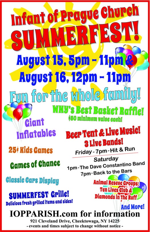 Infant Prague Church Summerfest- August 16, 2025 with live music by Hit N’ Run, Dave Constantino Band and Back to the Bars plus Giant inflatables and games for kids. 921 Cleveland Drive, Cheektowaga.