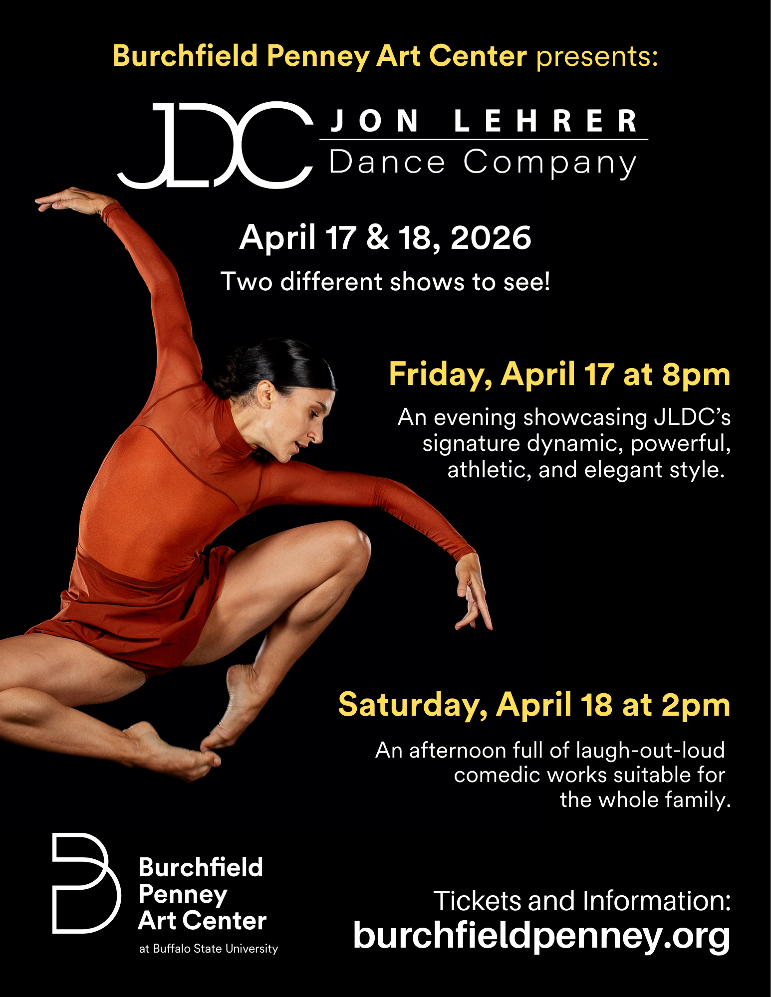 John Lehrer Dance Company at Burchfield Penny Art Museum- Saturday, April 18th at 2:00 p.m.An afternoon full of laugh-out-loud comedic works suitable for the whole family. Full of humor, joy, and cartoonish celebration that will leave the audience laughing and smiling all the way home. Tickets are $40.