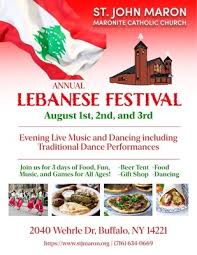 Lebanese Festival- August 21 to 3, 2025 at St. John Maron Church in Williamsville at 2040 Wehrle Drive feature food, performances and cultural displays. Admissionis $3 and free 11 and under for kids.