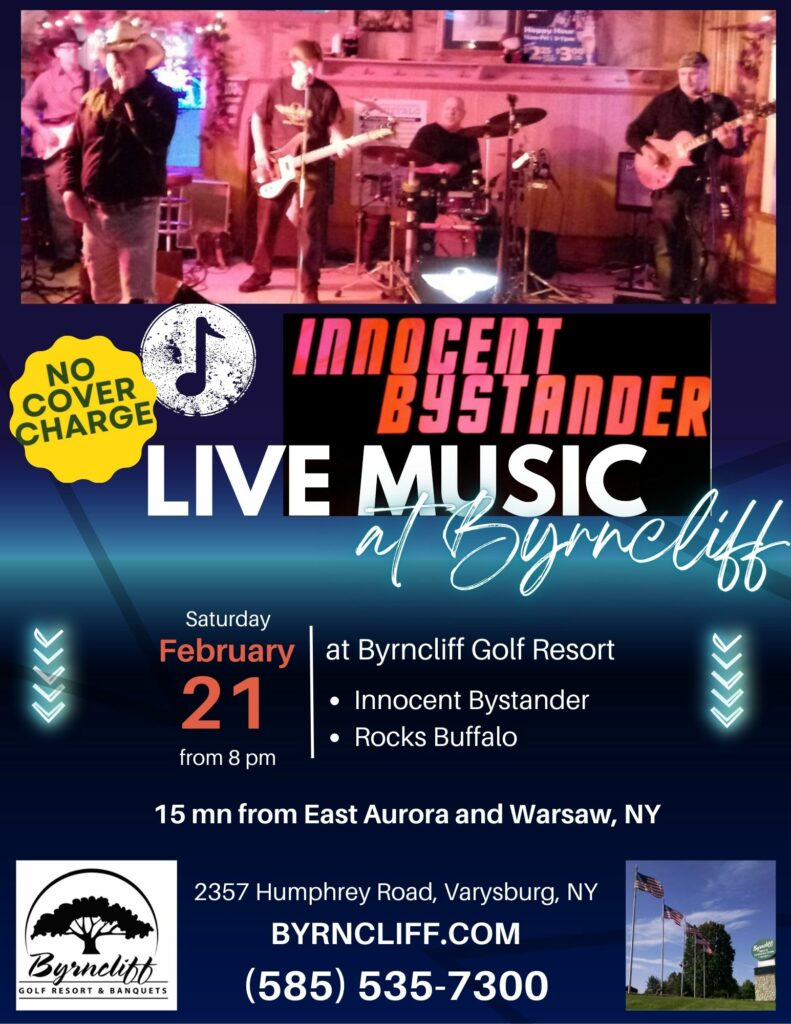 Live Music at Byrncliff Resort- Innocent Bystander- February 21, 2026 starting at 8pm. NO COVER. 2357 Humphrey Road.