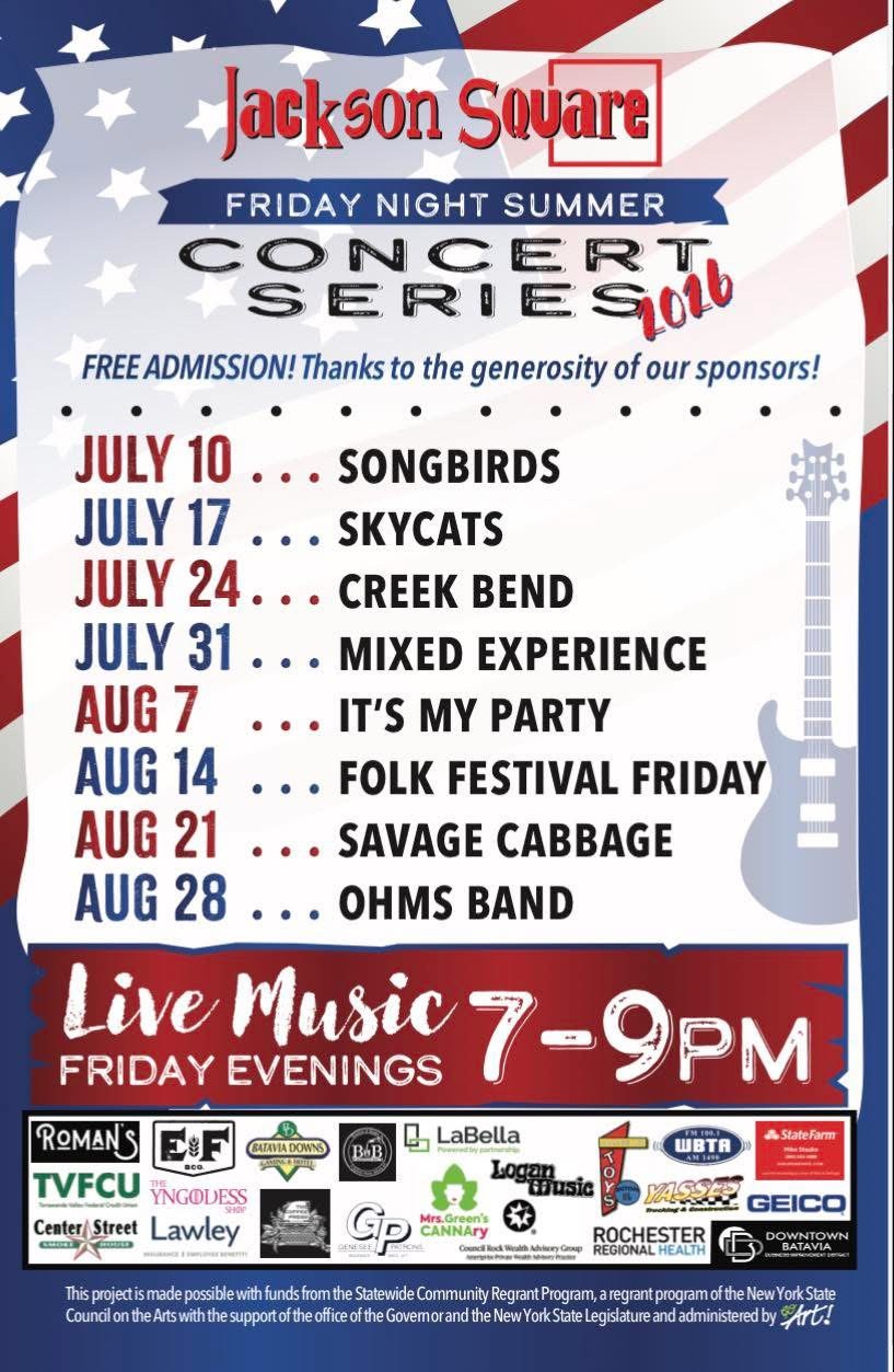 Live Music at Jackson Square- July 10 to August 28, 2026 from 7pm to 9pm. Friends have gone and said it was a great venue. FREE