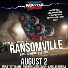 Monster Trucks at Ransomville Speedway- August 2, 2025 from 6pm to 8pm. Tickets are $25 for adults, and $15 for kids 3 to 12, track party pass is $10.
