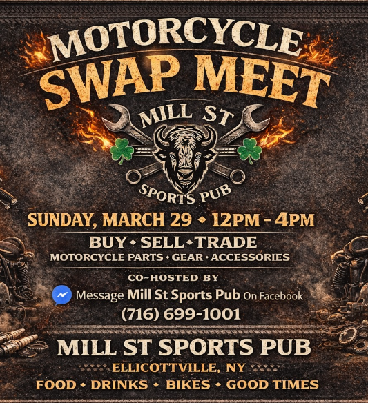Motorcycle Swap Meet at Mill St. Sports Pub- March 29, 2026 from Noon to 4pm. Buy, Sell, Trade.