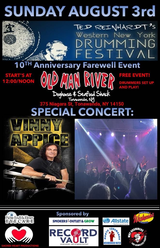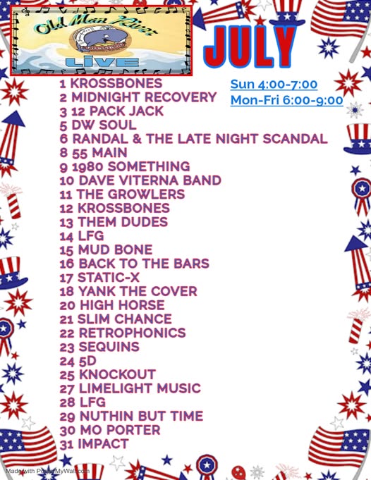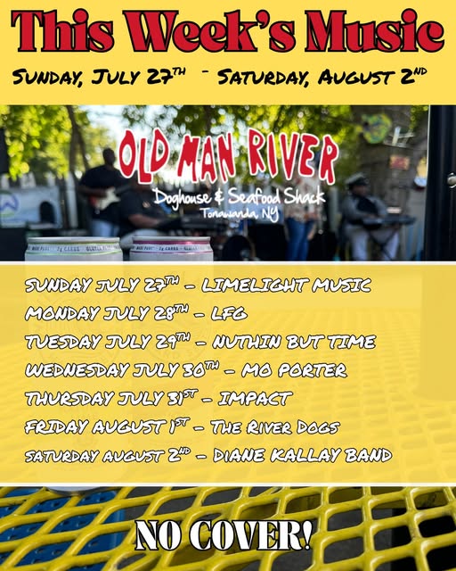Music at Old Man River-August, 2025 at 375 Niagara Street, Tonawanda. Also, Kids Eat free on Mondays. Plus, WNY Drumming Festival on August 3rd.