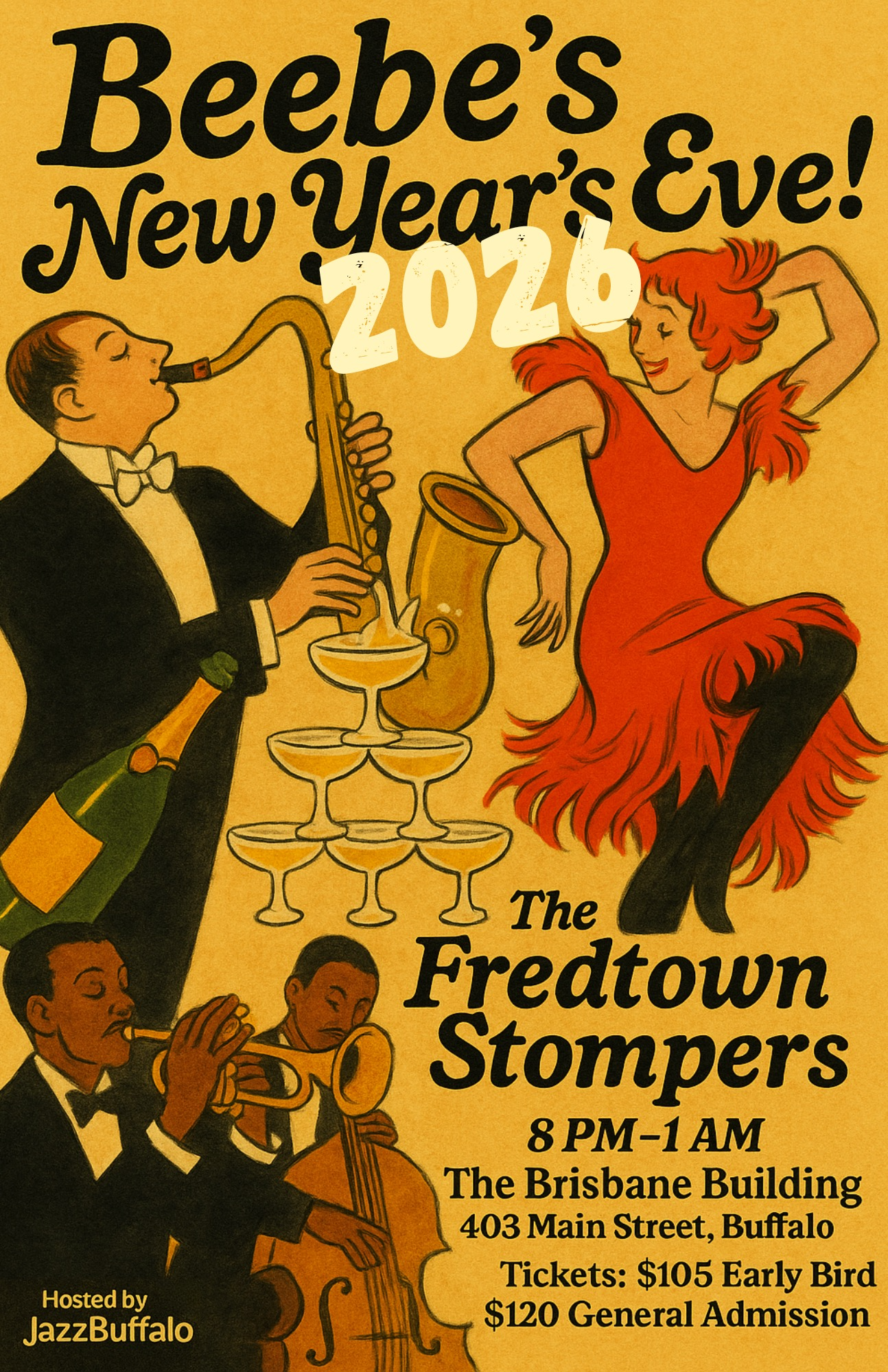 New Year’s Eve at Beebe’s Gallery at 403 Main Street, Buffalo featuring the Fredtown Stomper and- Oralia Catering on December 31, 2025. Starting at 8pm with open bar, small plates throughout the evening by Oralia Catering, free champagne toast and music by the Fredtown Stompers. Tickets are $105 early bird, then $120.