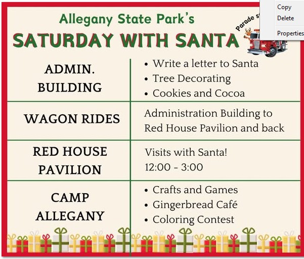 Saturday with Santa at Allegany State Park– December 6, 2025 from 11am to 3pm at the Red House area. FREE