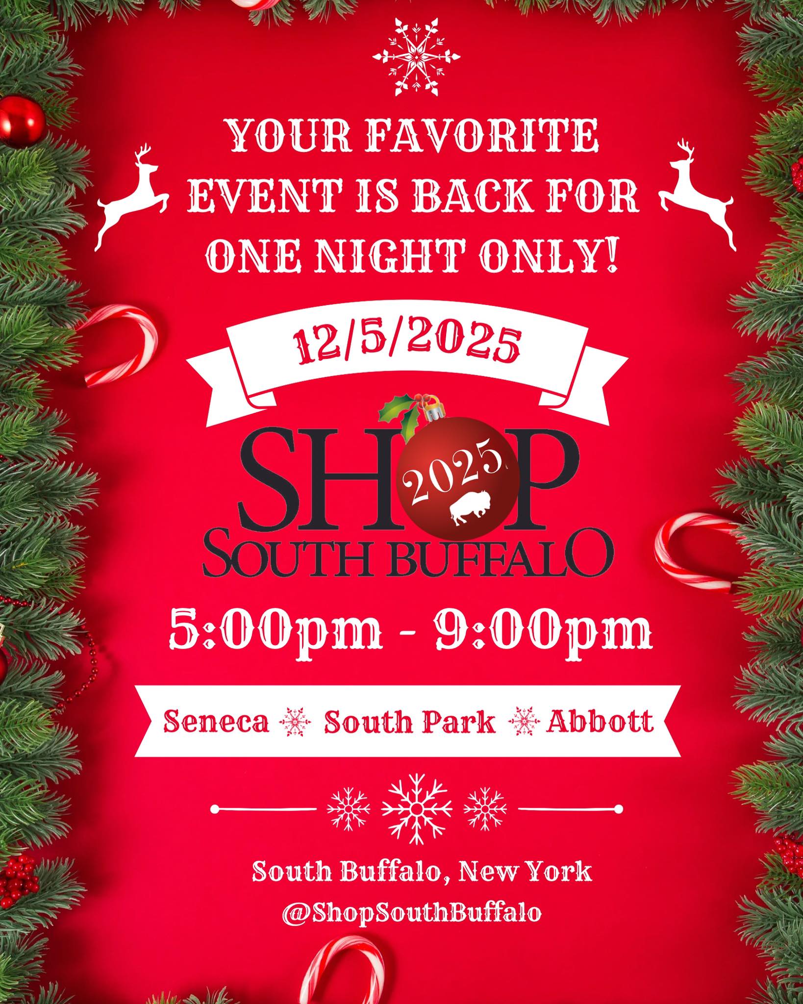 Shop South Buffalo– December 5, 2025 from 5pm to 9pm along Abbott Road, Seneca St and South Park Ave. with the kick off and after party at The Riverfield 865.