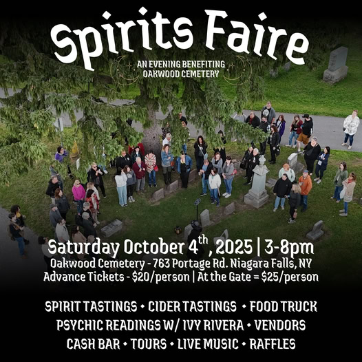 Spirits Faire at Oakwood Cemetery– October 4, 2025 from 3pm to 8pm. Spirit tastings, cider tastings, food truck, psychic readings, tours, live music. Tickets are $20 in advance, $25 at the door.