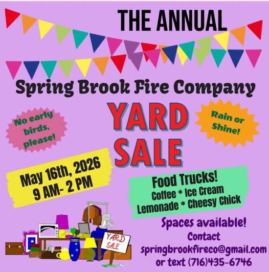 Spring Brook Fire Company Yard Sale- May 16, 2026 from 9am to 2pm at 31 Pound road on the corner of Seneca St.. Rain or Shine. Food Trucks. To join see ad.