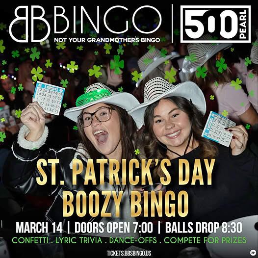 St. Patrick’s Boozy Bingo at 500 Pearl – March 14, 2026 at 7pm with ball drop at 8:30pm.Tickets are $27.69.