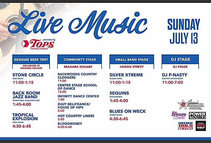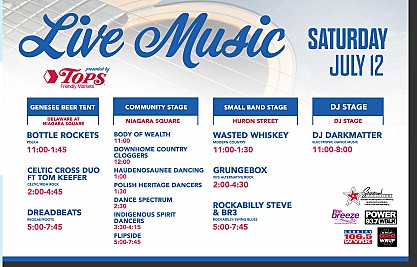 Taste of Buffalo at Niagara Square is 11am to 8pm on July 12 and 11am to 7pm on July 13th, 2025 with entertainment at multiple locations. Music Schedule. Festival Guide