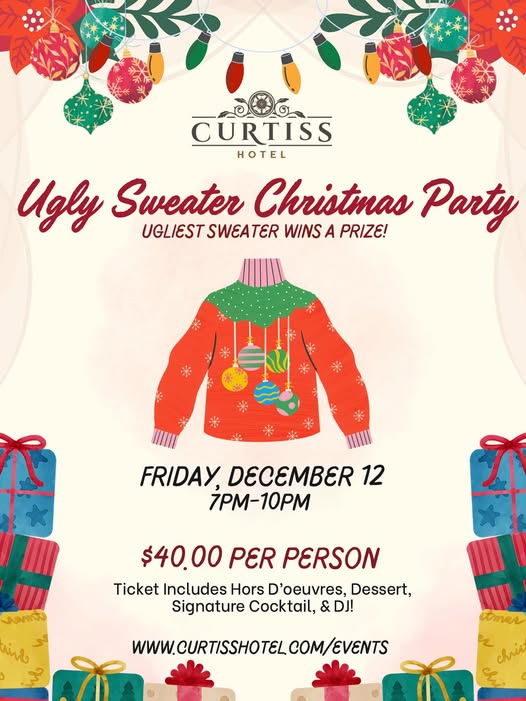 Ugly Sweater Christmas Party at Curtiss Hotel- December 12, 2025 from 7pm to 10pm. Tickets are $40 and includes hors d’oeuvres, dessert, signature cocktail and DJ.